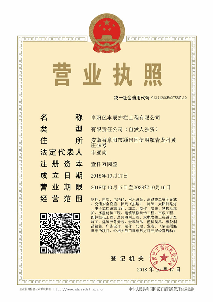 公司介紹 阜陽(yáng)億豐辰護(hù)欄工程有限公司成立于2018年10月17日,位于安徽省阜陽(yáng)市潁泉區(qū)伍明鎮(zhèn)青龍村黃莊49號(hào),法定代表人為申亞南。經(jīng)營(yíng)范圍包括護(hù)欄、圍擋、電動(dòng)門(mén)、出入設(shè)備、道路施工安全設(shè)施、交通安全設(shè)施、標(biāo)線(xiàn)(熱熔)、標(biāo)牌、太陽(yáng)能路燈、電子監(jiān)控設(shè)施設(shè)計(jì)、加工、制作、安裝、銷(xiāo)售及維護(hù),房屋建筑工程、建筑裝修裝飾工程、市政工程、園林綠化工程、道路照明工程、水電...